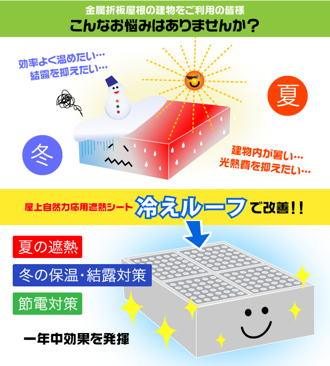 冷えルーフは、金属折板屋根用に開発された、まったく新しい遮熱・断熱システムです。夏は遮熱、冬は建物保温・結露対策として効果を発揮。年間を通して節電対策につながります。